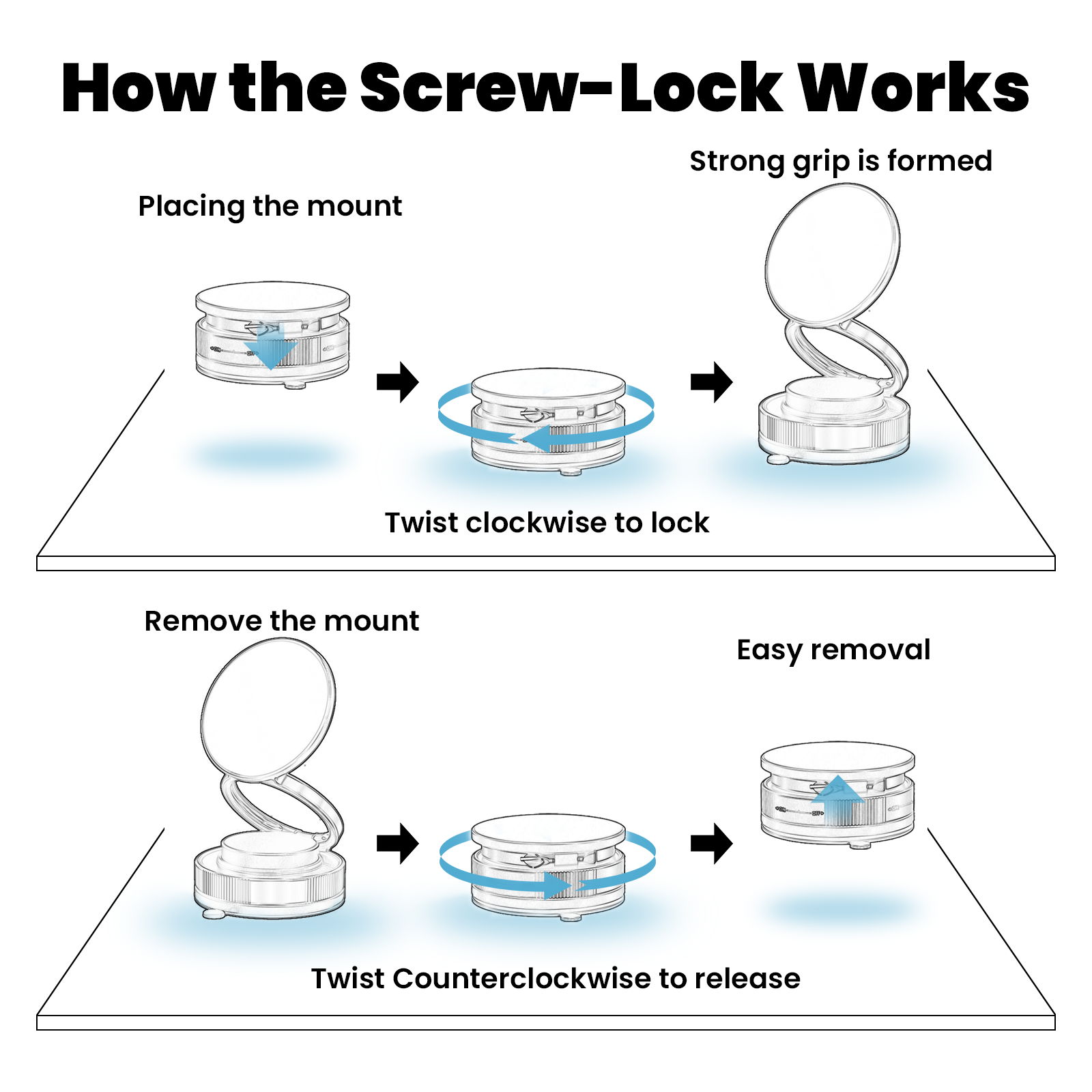 - Manual Screw-Lock Suction for Ultra-Strong Hold: With an impressive 5kg hold for 2 hours, the A303 provides stability on smooth surfaces like car dashboards, mirrors, desks, and gym equipment—no charging required.