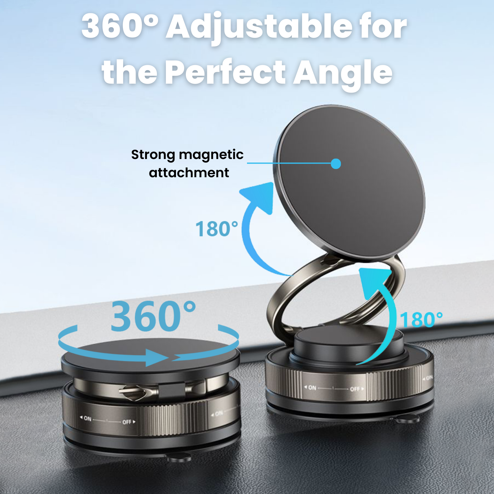 Introducing the A303, our most powerful phone mount yet, designed for hands-free convenience and ultimate stability. Featuring a 360° rotatable mount, this phone holder provides flexible viewing angles for content creators, drivers, gym-goers, and everyday use. With its manual screw-lock suction system, the A303 securely holds your device on smooth surfaces without relying on charging, offering a remarkable 5kg hold for 2 hours. MagSafe compatibility ensures a strong magnetic attachment for iPhones, while a metal ring is included for non-MagSafe devices. Enjoy unparalleled stability and flexibility wherever you need it!